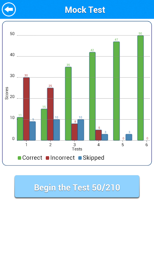 After you have practiced all types of questions, you can take a Mock Test with 50 questions. The Mock Test has questions selected randomly from each topic. Scores for the mock tests taken in the past are displayed in a bar chart. This is a great way to track how you are progressing in mock tests. There is no limit on how many mock tests you can take.