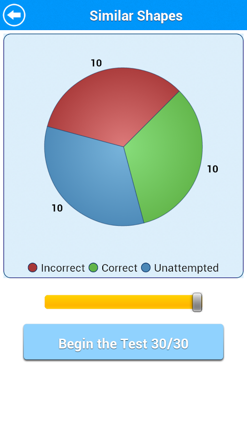 An interactive pie chart displays current progress for each topic. You can touch the different color slices of the pie and choose if you wish to answer only incorrectly answered questions, unattempted or correctly answered questions. This feature is very useful to achieve 100% score in each topic.