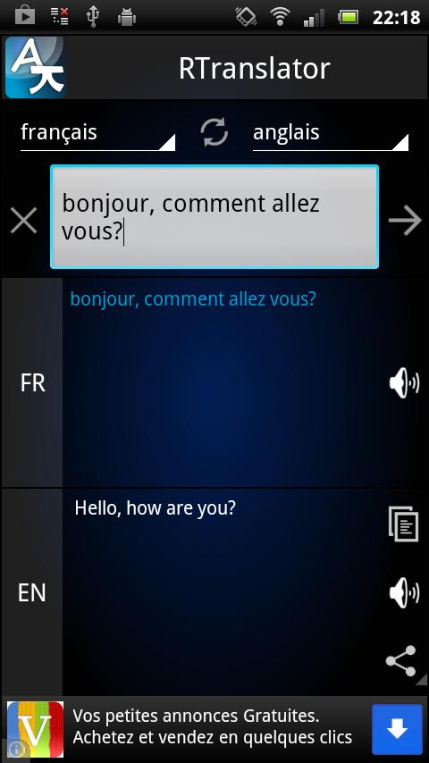 Translate words and phrases between more than 20 languages. For english, french, spanish, german and italian, you can hear the phrases or words to translate and the corresponding translations.
