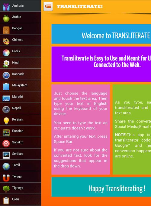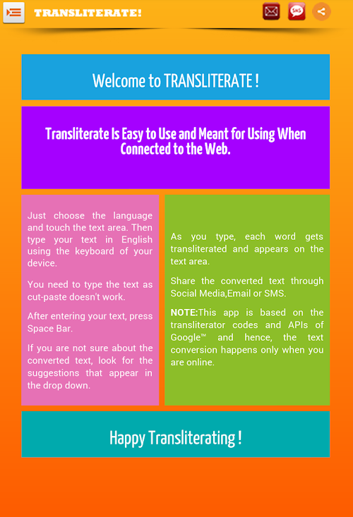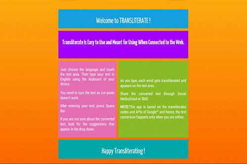 ATTRIBUTION: This app is based on the transliterator codes and APIs of Google™ and that is why you see the logo 'powered by Google' in the app. Google™ is not associated with this product or with the developer in any way. Neither Google™ nor this developer is responsible or liable for any errors, if any, that may appear in the transliteration process. All we, developers, want to do is to help people express better in their language tapping the great potential of the Google™ Transliterate APIs.