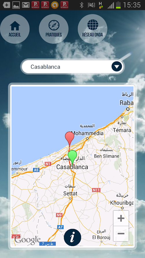 • Localisation des aéroports ONDA avec leurs géo-localisations, affichage de l’itinéraire et la possibilité d’appeler.