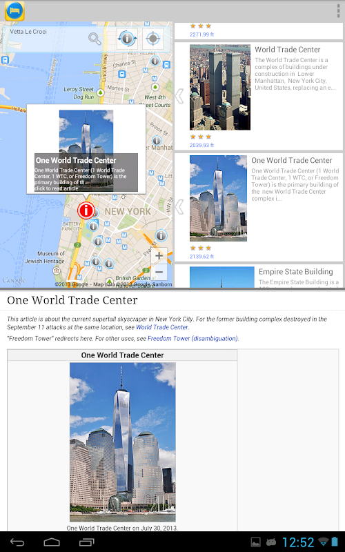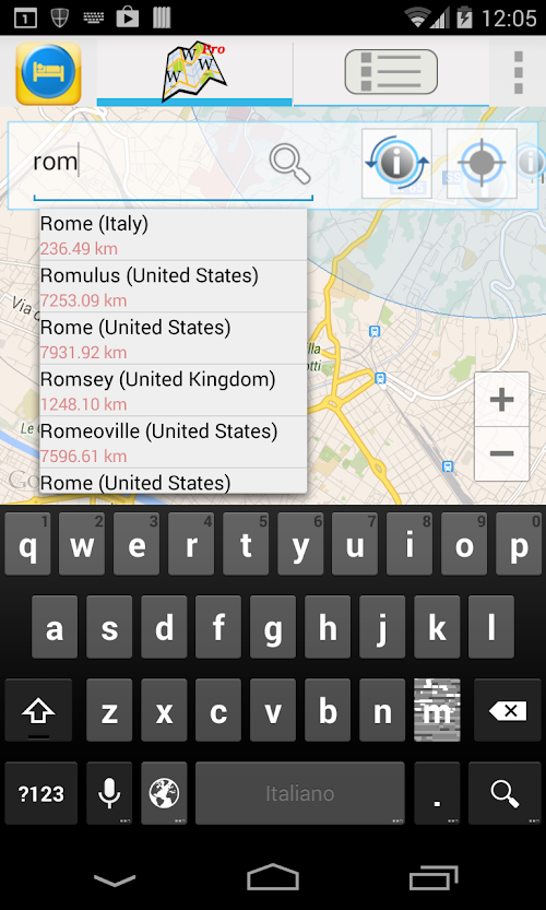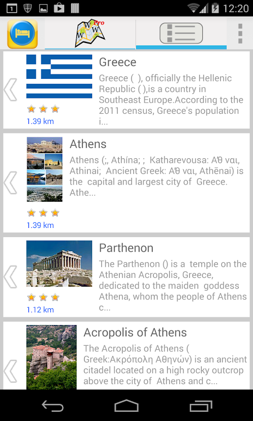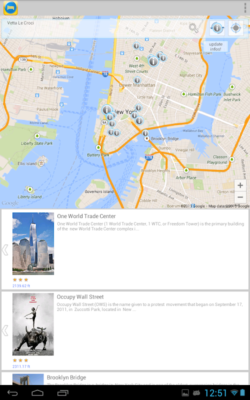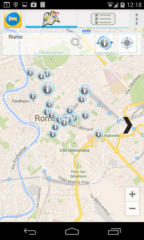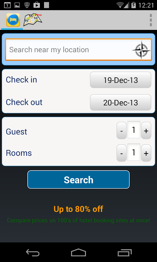 Travel &Hotel Map Guide Pro automatically centers on your current location using your location as determined by your network (3G or WIFI), or your GPS if enabled. Scroll the map and refresh the POI's to unveil new locations and their article. But you still can search for other places and the Travel &Hotel Map Guide Pro will guide you there unveiling the POI's near your searched location.