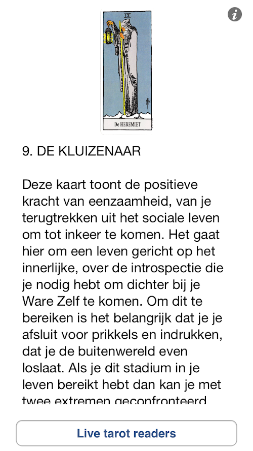 De rijke symboliek van de tarot en de beproefde referentiekaders van de diverse legmethodes staan garant voor het aanreiken van ontelbare aanwijzingen en impulsen, waarmee een ieder die bereid is om met open geest, hart en ziel er naar te kijken en te luisteren, inzicht geboden wordt.What wisdom does tarot you offer today? Relax, breathe and set in mind a question, pull a tarot card by clicking on the tarot deck. The card can then draw, could help solve problems.
