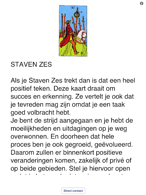 Tarot is een flexibel en krachtig instrument om snel inzicht te verkrijgen op allerlei gebied. Een Tarot dagkaart geeft een beeld rond het thema wat je bezighoudt. De kaart die op je scherm komt heeft betrekking op dat wat je bezighoudt te midden van jou omstandigheden. Er wordt iets getoond wat waar is ('waar-zeggen') over innerlijke en uiterlijke gegevens, over valkuilen en te leren lessen, over angsten, ambities en mogelijkheden, over sterke en zwakke kanten.