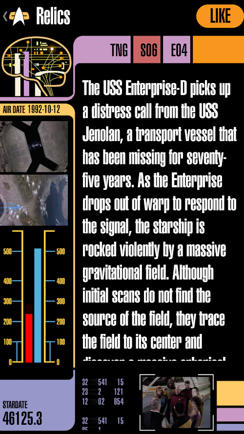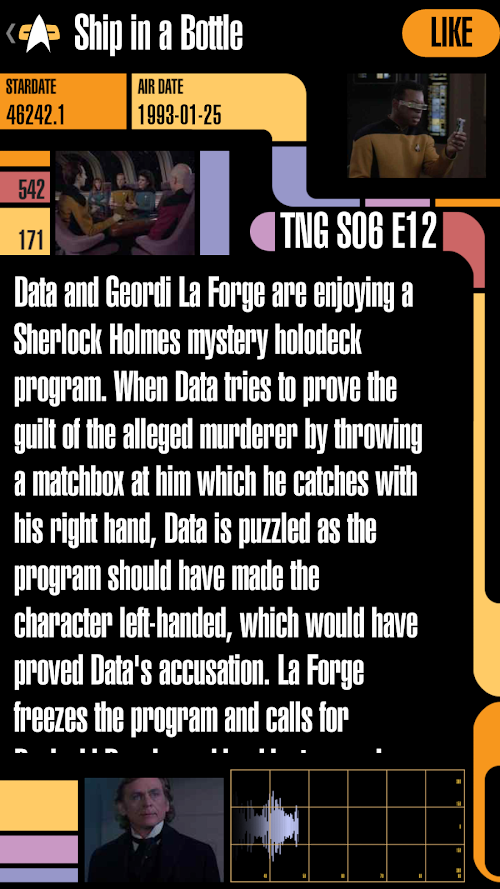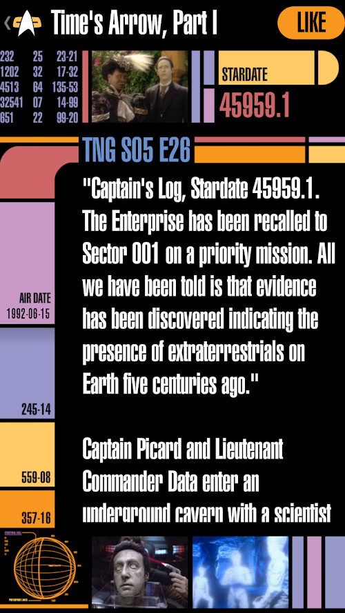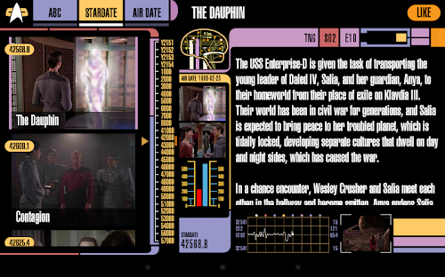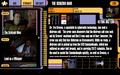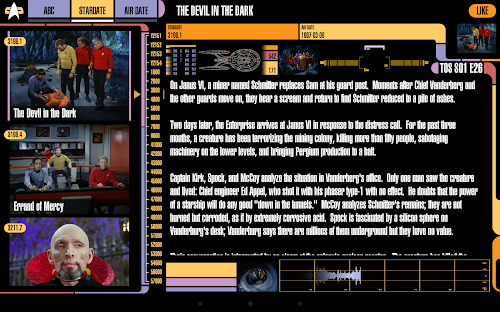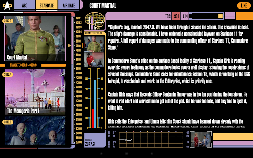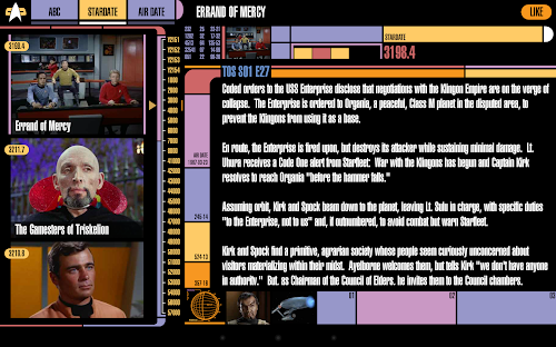 The Trek Episode Guide immerses Star Trek™ fans in an authentic LCARS style interface introduced in the Star Trek: The Next Generation™ television series, and provides a compendium of all Star Trek episodes and movies, with detailed plot descriptions and HD images (where available).