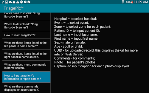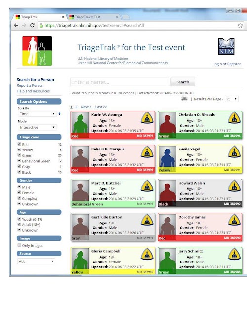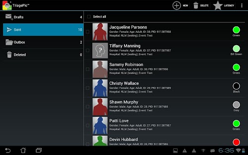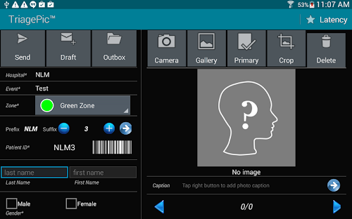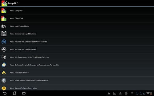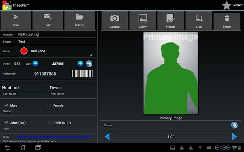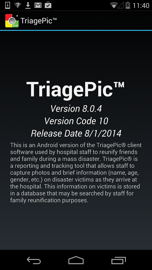 This is an Android version of the TriagePic® client software used by hospital staff to reunify friends and family during a mass disaster. TriagePic® is a reporting and tracking tool that allows staff to capture photos and brief information (name, age, gender, etc.) on disaster victims as they arrive at the hospital. This information on victims is stored in a database that may be searched by staff for family reunification purposes.