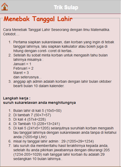 Sulap merupakan suatu seni pertunjukan yang diminati sebagian besar masyarakat di dunia, karena pada penyajiannya sulap dapat membuat heran penontonnya akan rahasia di balik penyajiannya. Sulap merupakan suatu gabungan dari berbagai seni yang ada, misalnya seni tari, seni musik, seni rupa, dll dan merupakan penerapan dari gabungan berbagai disiplin ilmu yang ada. Misalnya ilmu fisika, ilmu biologi, ilmu kimia, ilmu psikologi, dan lain-lain. Seni Sulap bukanlah suatu keterampilan yang berbau klenik atau supranatural, karena setiap trik sulap dapat dijelaskan. Sulap semata-mata hanyalah permainan "kelihaian" tangan, manipulasi, hasil kerja dari suatu perlengkapan/ peralatan ataupun efek yang timbul dari suatu reaksi kimia dan yang telah dilatih sebaik mungkin oleh seorang pesulap sebelum dipertunjukkan kepada orang lain. Oleh sebab itu sulap dapat dipelajari oleh semua orang, asalkan orang tersebut mau berlatih pula dengan baik.Magic is an art show interest most people in the world, for the presentation of magic can make the audience wonder will be the secret behind the presentation. Magic is a combination of a variety of existing art, such as dance, music, fine arts, etc. and is an implementation of a combination of existing disciplines. Eg physics, biology, chemistry, psychology, and others. Art of Magic is not a skill that smelled of occult or supernatural, because any magic tricks can be explained. Magic merely play the "cunning" hand, the manipulation, the work of a gear / equipment or effects arising from a chemical reaction and who have been trained as possible by a magician before shown to others. Therefore, magic can be learned by everyone, as long as that person wants to practice too well.