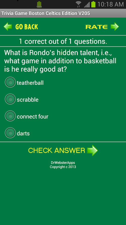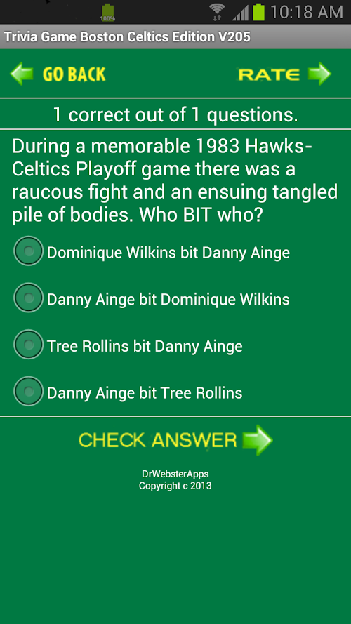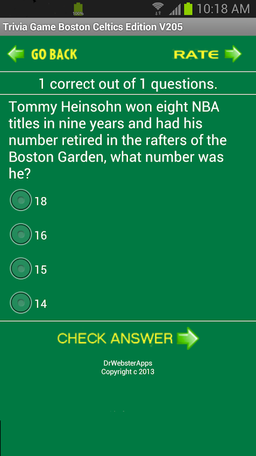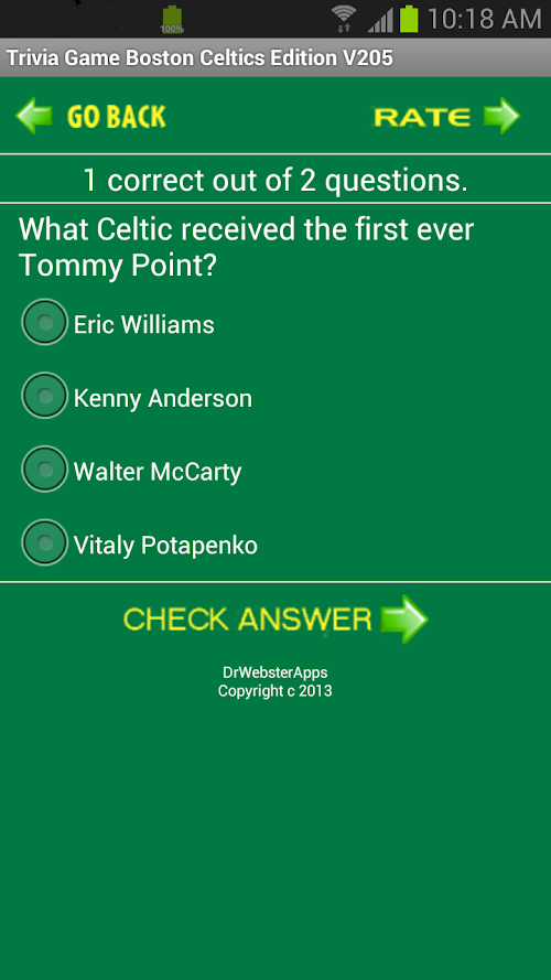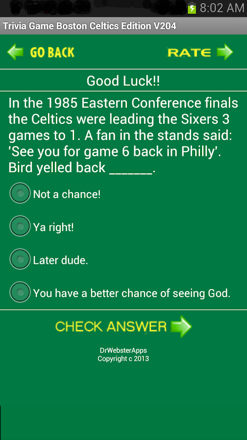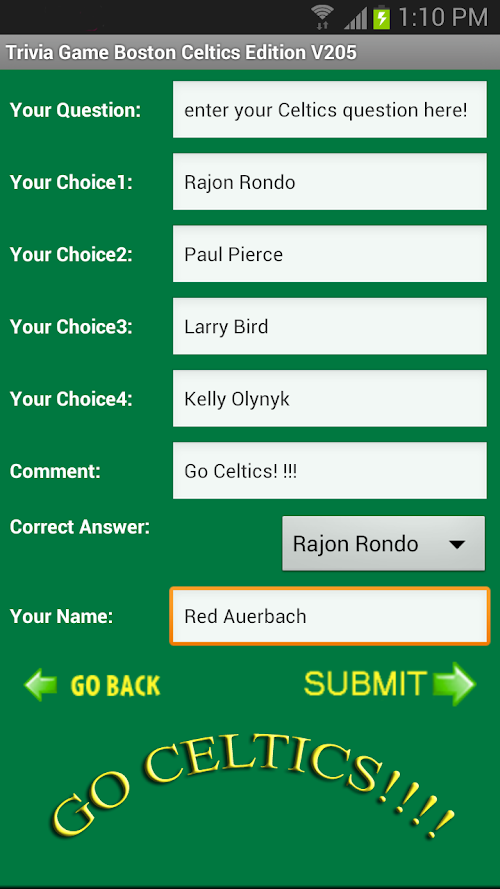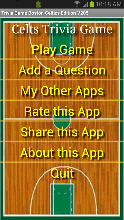 The app has access to even more great Celtics Trivia questions! We also added a new feature to pick a random starting question number, and show the All Time Scores, when your are in the Play Game Mode hit the phone's Menu button. We now keep a running score. GO CELTICS!!!