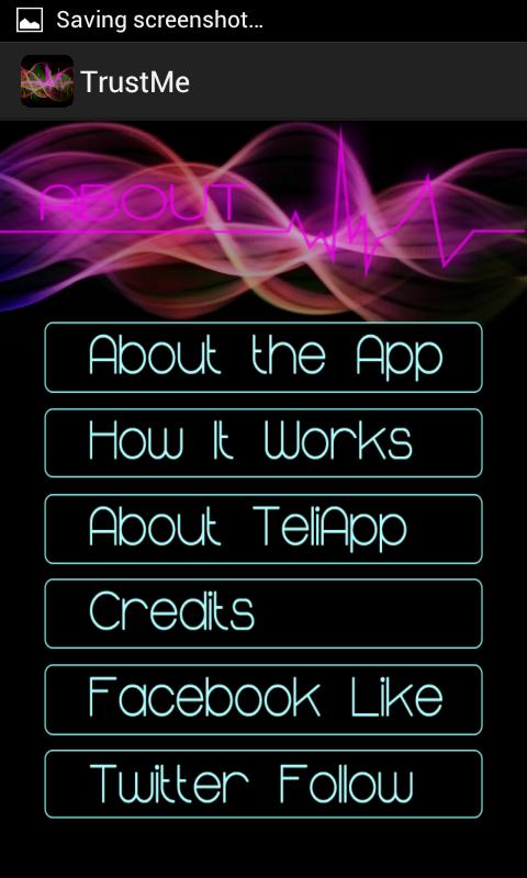 Listen up! Trust Me wont let you get away with lying. The Trust Me app is not designed to override people’s basic senses and make them do whatever you want. But – we believe that Trust Me is the most powerful tool that you can use to give people near you a sense of trust in you. Trust Me is about sending out the positive energy that makes people say, “I dunno. I just got a good vibe.” As with all of our enhanced social interaction apps, everyone – by using this app you are promising to use this app only for good – and never for evil!