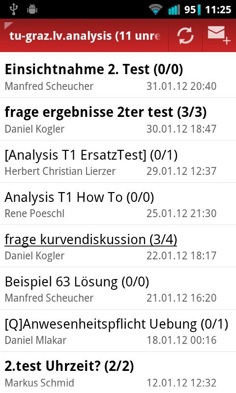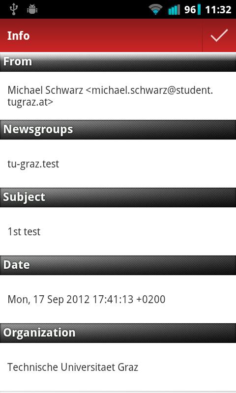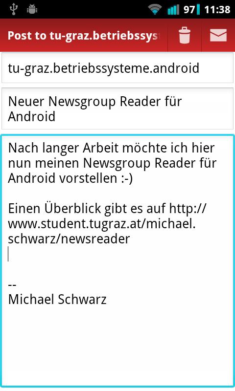 TU Graz Newsreader is an Android newsgroup (NNTP, Usenet) reader for the University of Technology, Graz. It makes it very simple to browse through all the newsgroups and allows you to post directly from your smartphone or tablet. Once downloaded, the posts are even available without internet connection.