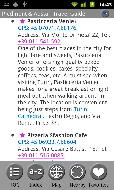 MobileReference Travel Guides provide detailed, practical information about attractions, landmarks, transportation, cultural venues, dining, lodging, history and much more. They are indexed alphabetically and by category, making it easier to access individual articles. Attractions can be viewed on an offline GPS map along with your current location so that you can easily find attractions near you as you explore the city.