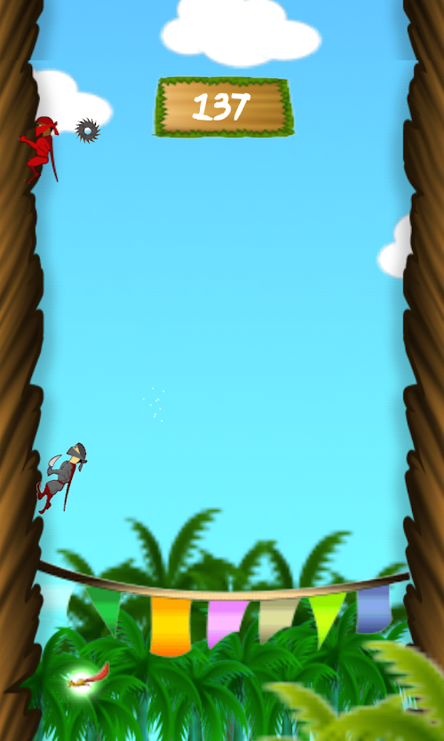 Nuestro personaje, mitad pirata mitad ninja, en busca de una mejor visión en tierras desconocidas, se aventura a trepar palmeras sin tener idea de los peligro que enfrentará. De tu habilidad depende que pueda llegar a lo más alto.Our character, half ninja half pirate, looking for a better insight into unknown lands, ventured to climb palm trees with no idea of the danger they face. Depends on your skill you can get to the top.