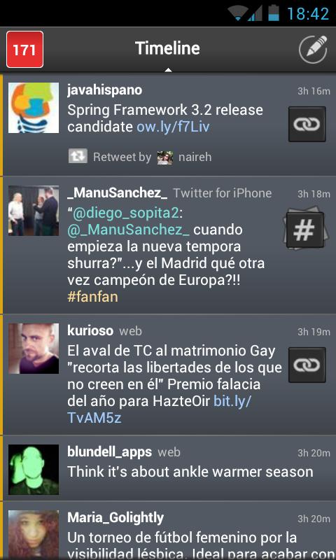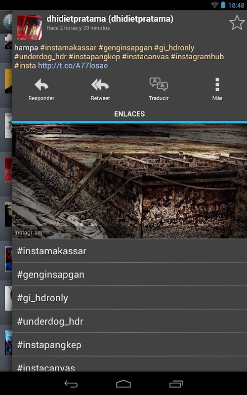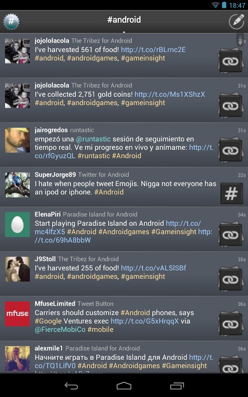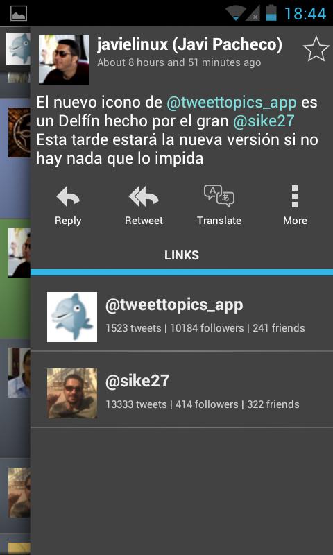You can perform the common actions you do on Twitter and also customize your searches to the maximum by selecting the language to translate the tweets, to filter messages that only have pictures or video, view messages received or sent by an user, to filter by geolocation, etc.. You can also notify the search results, share and more.