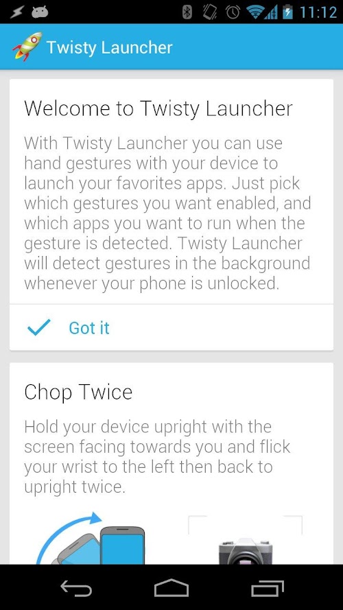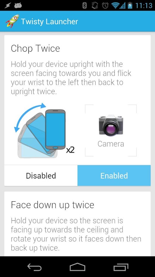 With Twisty Launcher opening your favorite apps is easier than ever. All you need to do is hold your phone in your hand and flick to the left twice to open your camera. Twisty Launcher will look for this hand gesture from the background, so you can perform the gesture from inside any app. This makes it super easy to not miss a quick photo opportunity.