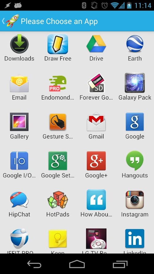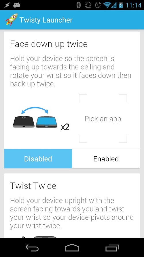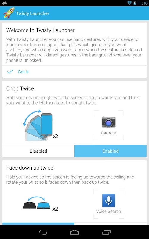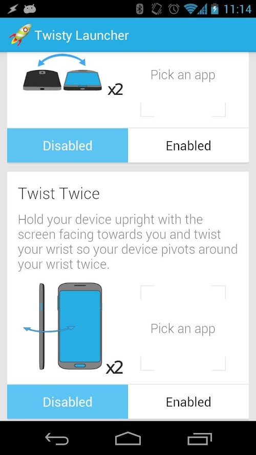 No need to fumble around trying to quickly open your favorite apps. Twisty launcher allows unlocking up to three different gestures. Each gesture can be configured to launch the app of your choosing.