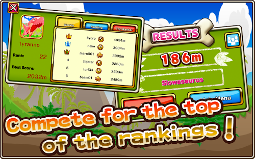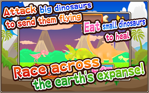 Your dinosaur needs food, so tap "EAT" to eat yellow dinosaurs and heal. Tap "ATTACK" to headbutt the dinosaurs that get in your way. If you eat three eggs, your dinosaur will become gigantic. Then, you can eat any dinosaur.