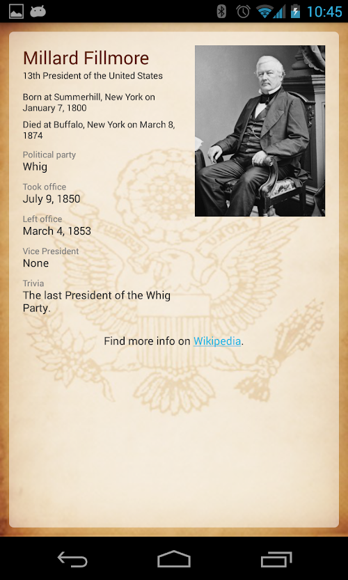 Learn about the U.S. presidents - years in office, birthplace, trivia, party, vice presidents and more. Test yourself with Quiz mode. Find presidents by search or index. Kick-back and enjoy a presidential parade!