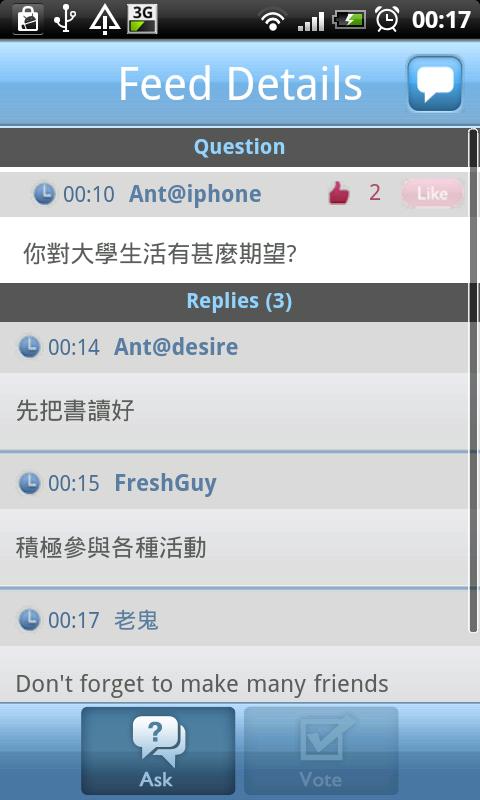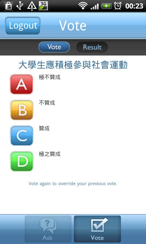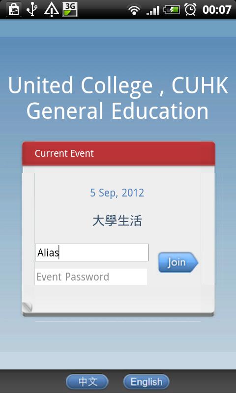 United College, founding College of The Chinese University of Hong Kong, introduces this mobile platform to facilitate the interaction between teachers and students in the General Education courses. Utilizing the flexibilities of wireless network and popularity of mobile devices, the application aims at providing a useful tool to assist the teaching and learning activities in large class environment; where time and setting limit the interaction between teacher and students.