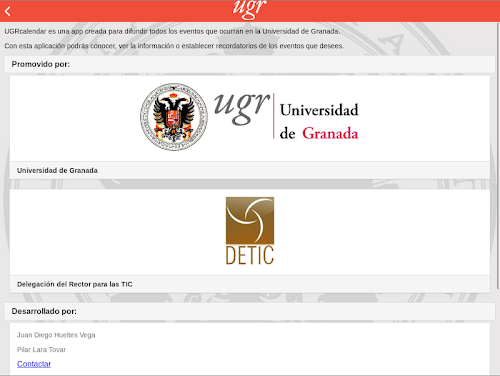 La Universidad de Granada recoge en la página web http://apps.ugr.es un listado de las principales aplicaciones para móviles que se desarrollan en el seno de la institución y que se distribuyen de forma gratuita. Las aplicaciones están destinadas a usos docentes, investigadores o de gestión, y tienen como finalidad informar o mejorar los servicios que se ofertan desde la UGR.UGRcalendar information in a calendar all events interest you and that occur at the University of Granada. You can set up categories that interest you the most and when you want to be reminded of an event date.