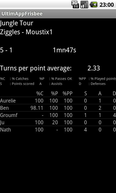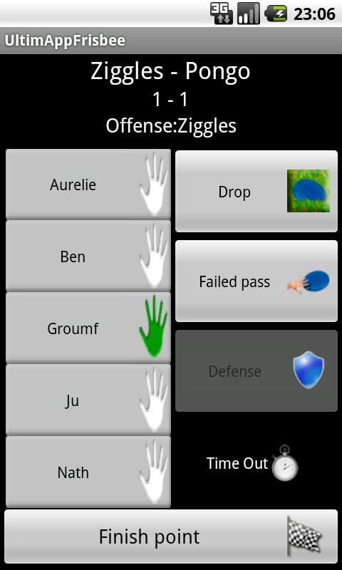 In addition to the Statistics mode, Ultim’App Frisbee introduces the Management mode. As asked by the French Co-Ed team, you can now manage your team. In one glimpse, see all your team members, how many points they played and for how long they rest. With the Hybrid mode you can keep following actions so as to have stats, but after a point is scored the management screen will pop to help you choose a new line.