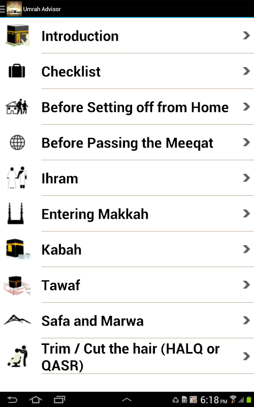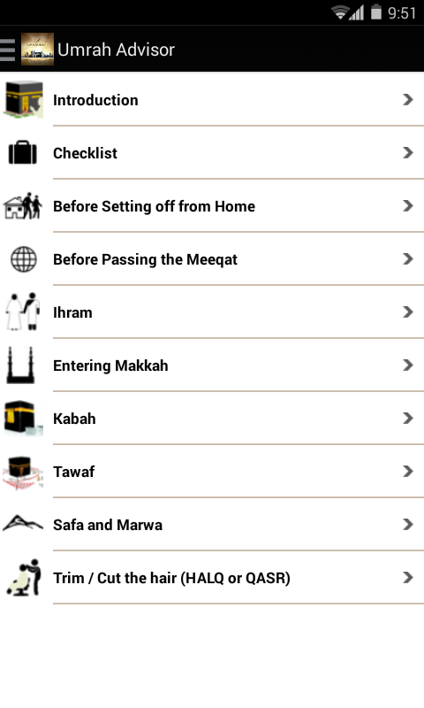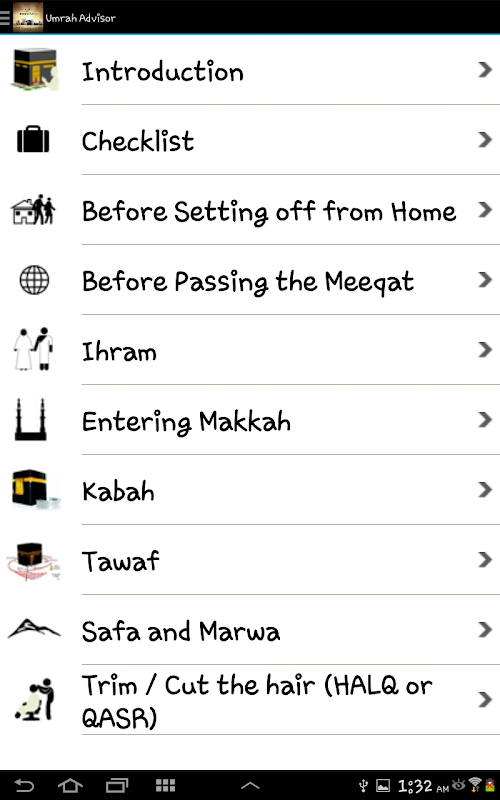 Umrah Advisor provides the users with comprehensive, one-stop guide on how to perform Umrah with details on: