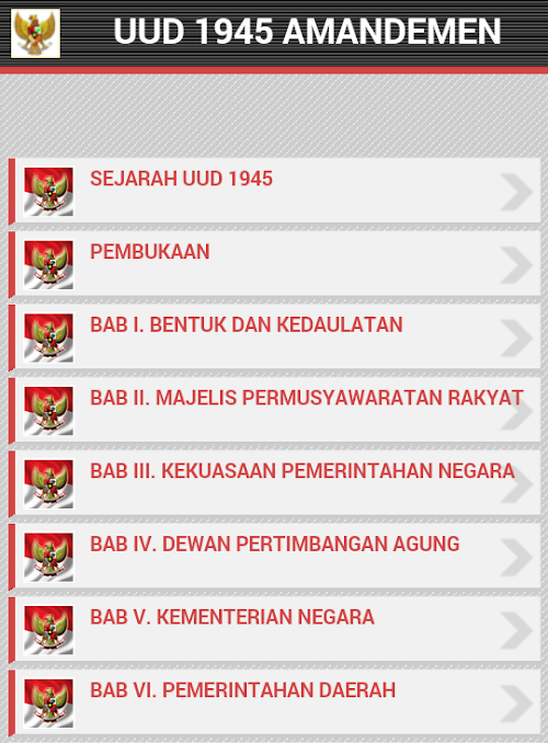 Undang-Undang Dasar Negara Republik Indonesia Tahun 1945, atau disingkat UUD 1945 atau UUD '45, adalah hukum dasar tertulis (basic law), konstitusi pemerintahan negara Republik Indonesia saat ini. Aplikasi ini memuat Undang - Undang Dasar 1945 hasil amandemen tahun 1999 hingga 2002. Setelah dilakukan 4 kali perubahan, UUD 1945 memiliki 16 bab, 37 pasal, 194 ayat, 3 pasal Aturan Peralihan, dan 2 pasal Aturan Tambahan.Constitution of the Republic of Indonesia Year 1945, or abbreviated as 1945 or '45 Constitution, is the basis of the written law (basic law), the constitutional government of the Republic of Indonesia today. This application contains Act - 1945 amendment 1999 to 2002. After 4 times change, the 1945 has 16 chapters, 37 articles, 194 paragraph, Article 3 of the Transitional Provisions, and 2 of article Additional Rules.