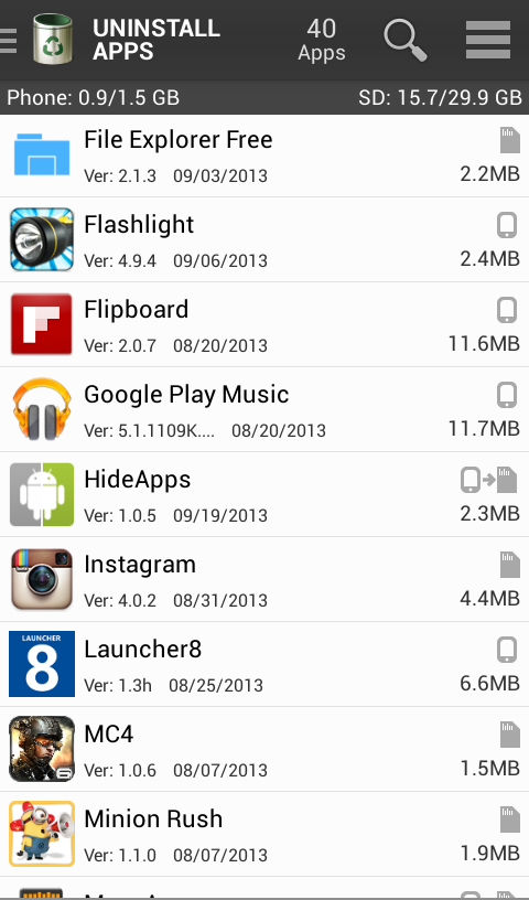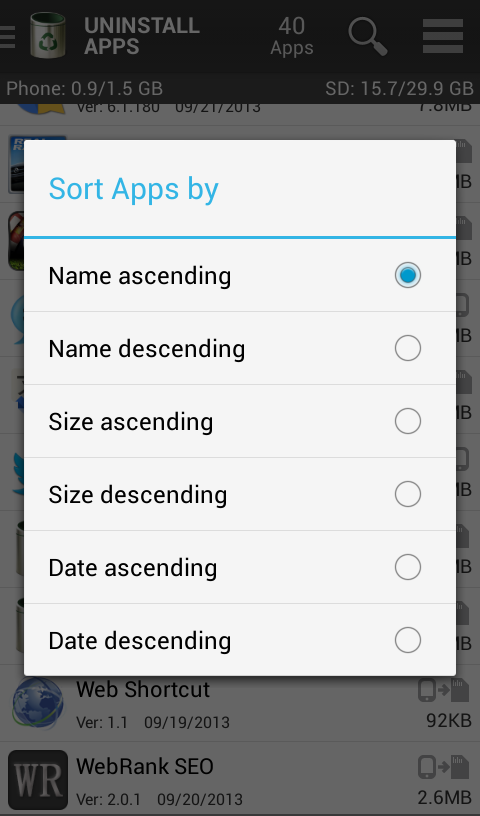 → Sort By: Sort apps list by name, size, date in both ascending or descending order.