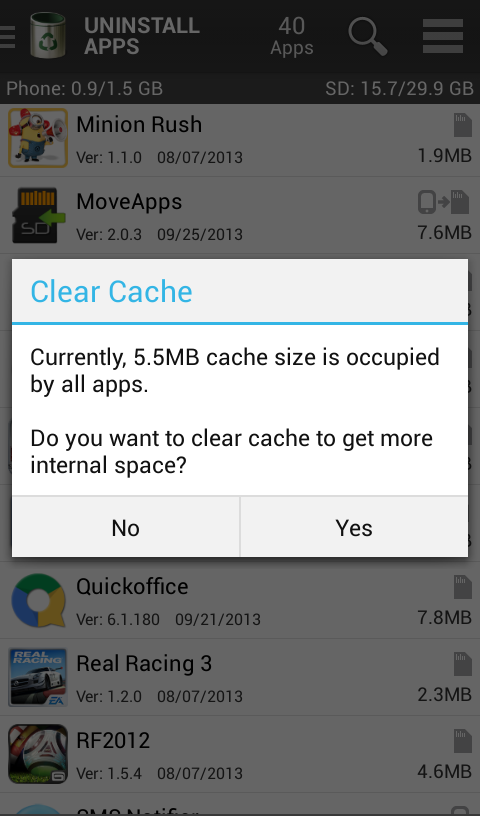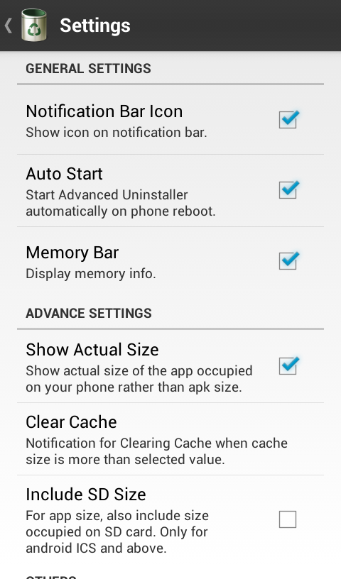 → Settings: Some advanced options to customize the appearance and functionality of UninstallApps, which include option to show a persistent notification of UninstallApps, show or hide memory bar, choose when to display cache clear notification as well as whether to show total app size including occupied cache and SD card size.