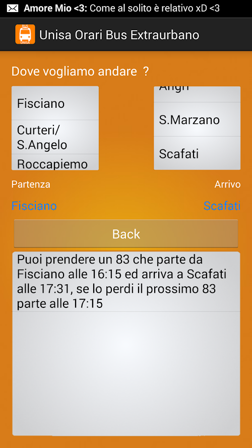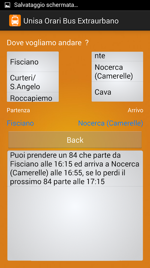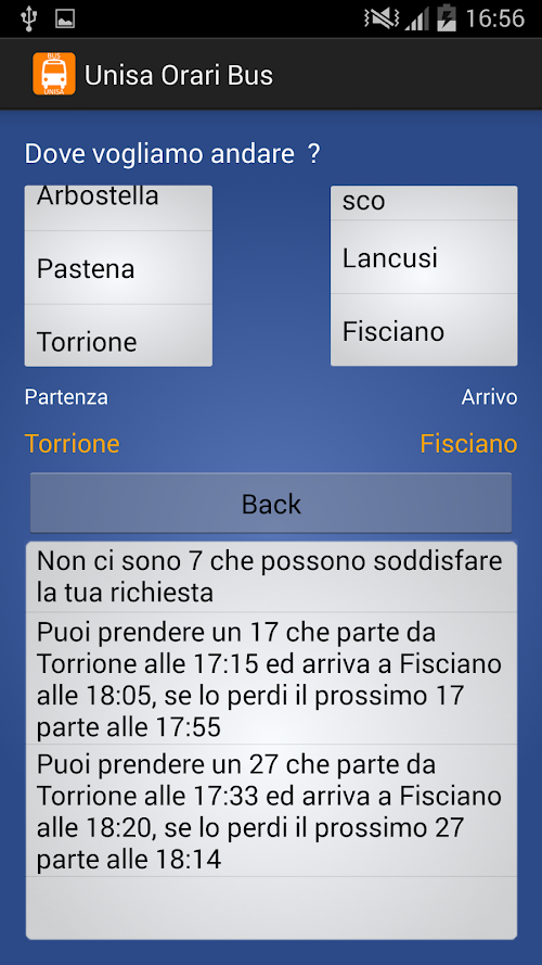 Dedicato alla persona che da anni pazientemente mi aspetta ogni mattina.Do all'Unisa and want to go home? or you are salerno and you have to follow? want to avoid a lot of time to wait? want to know when the next bus passes? simply select departure and destination, click on the search button and you'll know right away when the next bus will pass. The app will look between the lines universities which can take you to your destination based on the current time. The times are constantly updated, currently at 09/15/2014, immediately after the reorganization, and can help you identify which 7,17 or 27 passes for medicine. Unisa hours Cstp, once installed does not need an internet connection, just remember to update, when proposed, the app to always have the last few times.