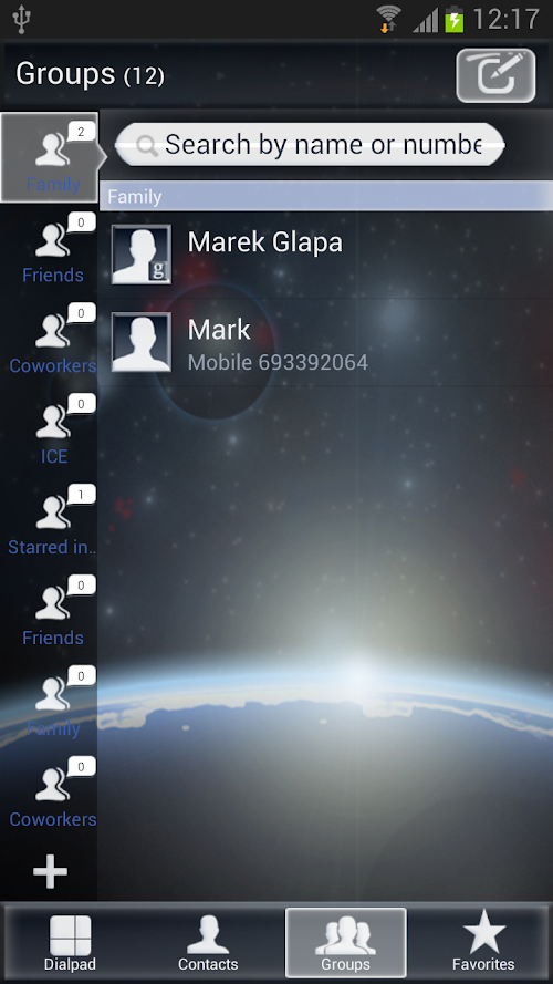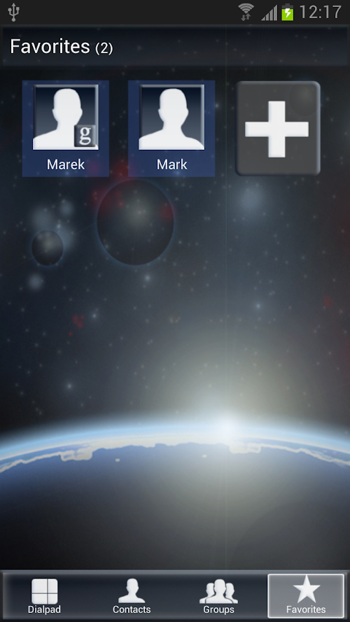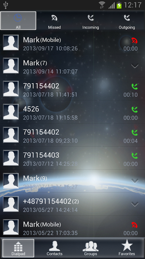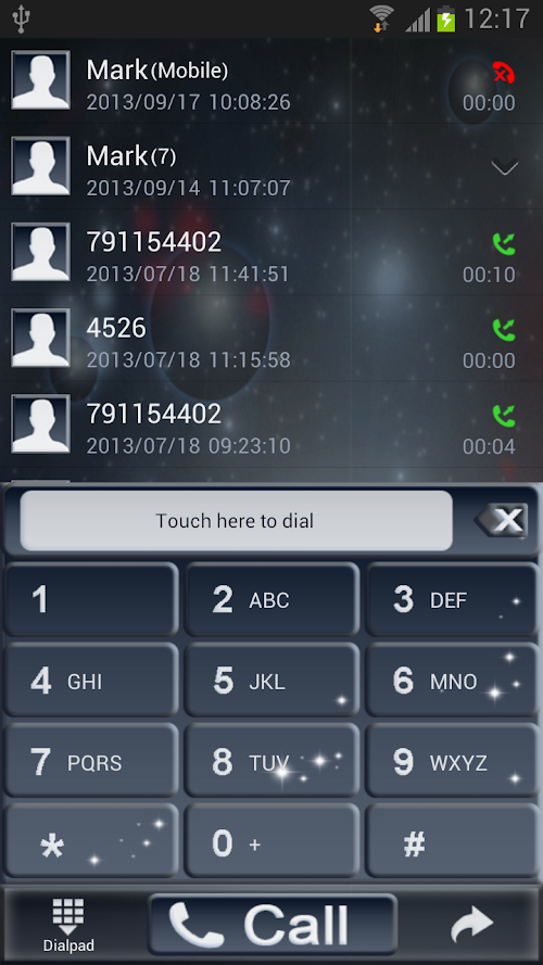 Wallpaper of theme shows part of the Earth and other planets. In the wallpaper are also stars. Names of contacts are white, date and time are gray, keys are in white blue and gray colors. On keys are stars. Other elements are in the same colors. Other lists of contacts are also in white blue and gray colors and have wallpaper which shows cosmos. If you are intersted about astronomy and if you like to learn about universe this application is the best for you. Application is free of a charge.
