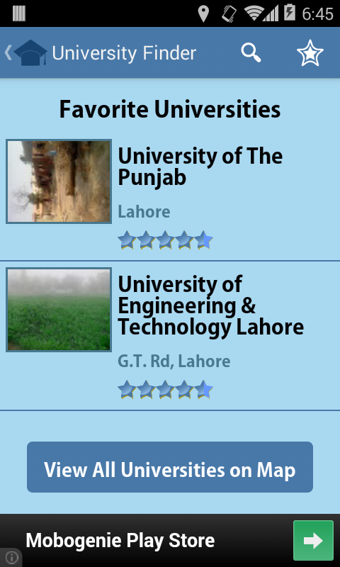 You can also save your university just by clicking Add To Favorite button in University Finder app. In University finder you can see a university reviews before going to it. There is also a search feature available in university Finder. If you want to see the University around the world you can simply type your keyword in University Finder search bar.