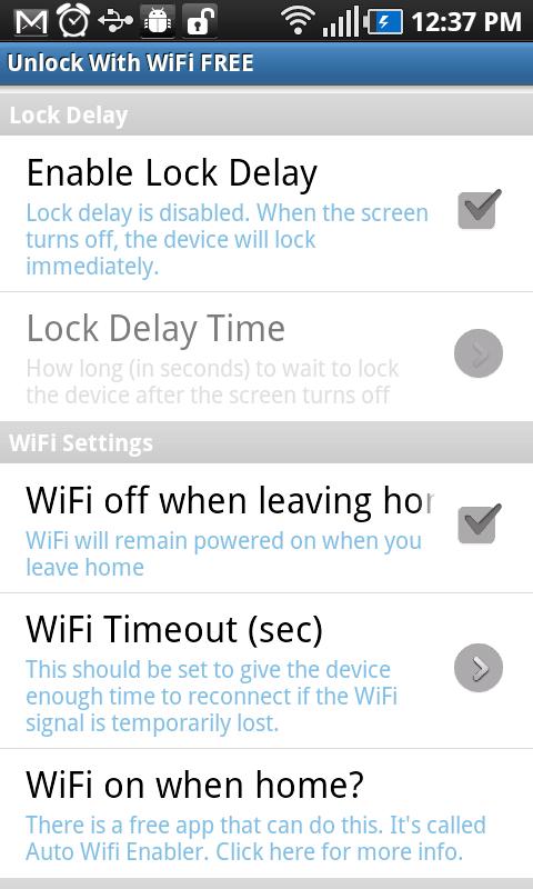 Tired of entering your password every time you turn on your phone? Unlock With WiFi™ unlocks your phone when you're connected to your home WiFi network. When you're at home, or work, you don't need to worry about losing your phone, so why should you have to enter your password?