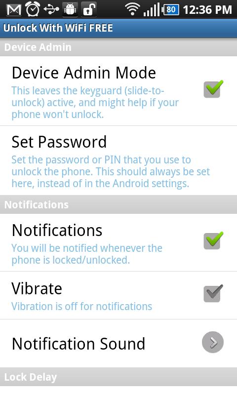 You can also set a lock delay, for when you're not at home. The default delay is set to 5 seconds (you can adjust it), so when you turn the screen off, the device won't lock until 5 seconds have passed. That way, if you remember something you forgot to do, you can turn it back on without entering your password. This feature is considered experimental at this time. It works on most devices, but isn't guaranteed to work on all devices.