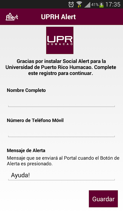 UPRH ALERT! Es una aplicación de seguridad para los estudiantes y facultad de la Universidad de Puerto Rico de Humacao. De encontrarse en una situación de peligro dentro de los predios del recinto, con solo presionar el botón de la aplicación, se enviará una alerta con su ubicación al cuerpo de vigilancia de la institución.