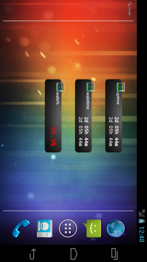 Simple 2x1 widget that displays the current and maximum uptime or waketime of your phone, or the % time awake. Uptime is the time since last boot. Waketime is time awake (not sleeping) since last boot.