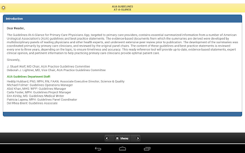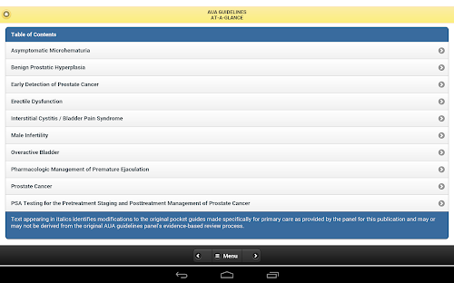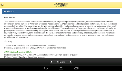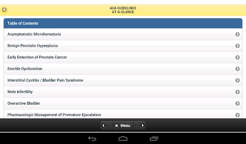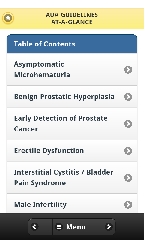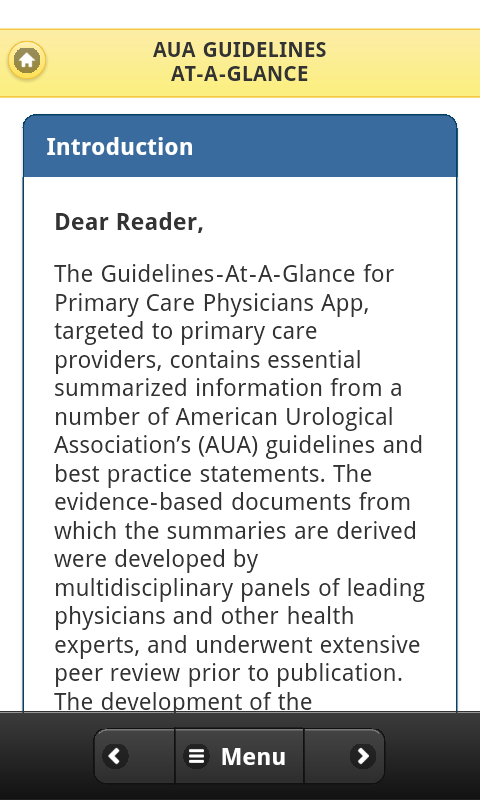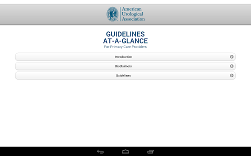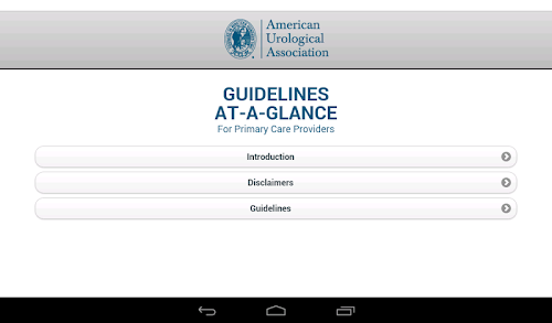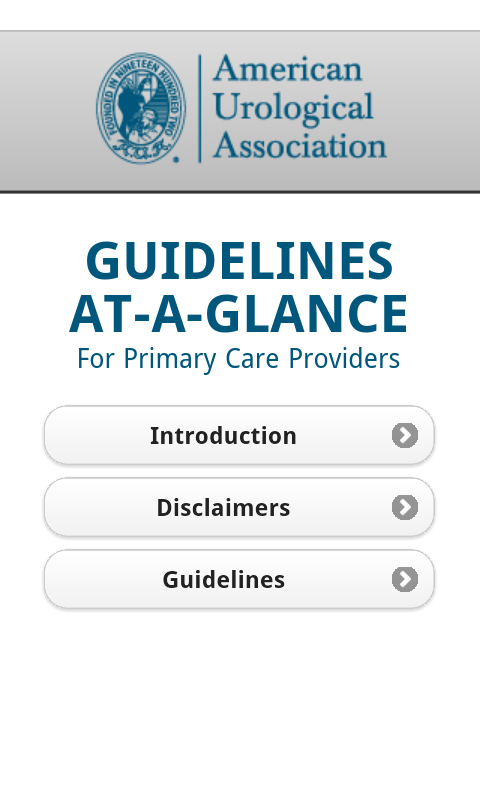 The Guidelines-At-A-Glance for Primary Care Physicians App, targeted to primary care providers, contains essential summarized information from a number of American Urological Association's (AUA) guidelines and best practice statements. The evidence-based documents from which the summaries are derived were developed by multidisciplinary panels of leading physicians and other health experts, and underwent extensive peer review prior to publication. The development of the summaries was coordinated primarily by primary care clinicians, and reviewed by the original panel chairs. The content of these guidelines and best practice statements is reviewed every one to three years, depending on the topic, to ensure timeliness and accuracy. This ready reference tool will provide up-to-date, evidence-based statements, expert clinical opinion, and pertinent information to help practicing primary care clinicians provide optimal patient care.
