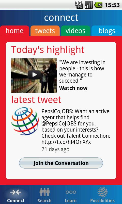 At your fingertips you’ll find the latest video releases from PepsiCo, updates from the PepsiCo employee blog and have the chance to read and respond to the latest tweets from the recruiting team behind @PepsiCoJOBS