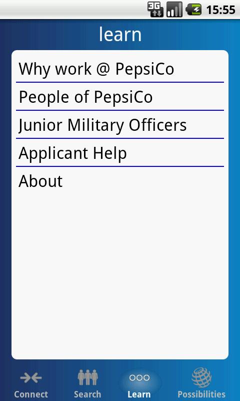 It’s never been easier to stay current on what’s happening around career possibilities or to connect with the talent within the teams at PepsiCo than it is today. With the new Possibilities… application you’ll now have the latest video, tweets, blog entries, job search tools and alerts all in the palm of your hand!