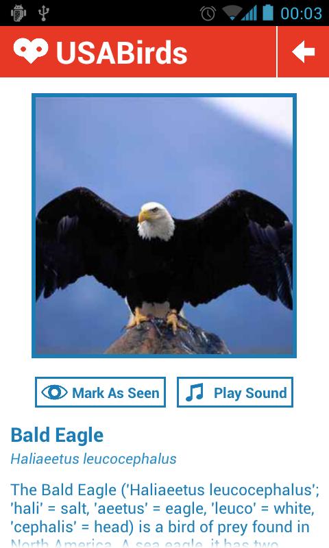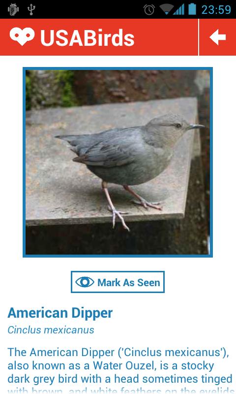 Bird watching app containing photos and information for over 340 birds that either live or have been spotted in the USA.