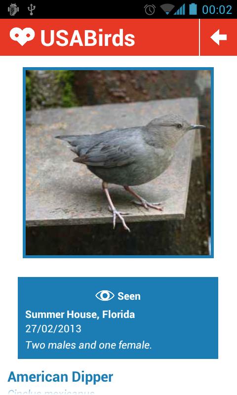 Works completely offline, with no need for additional downloading. Filter birds based on type or whether you've seen them, or search for them by name. Enlarge the images for easier viewing by touching them.