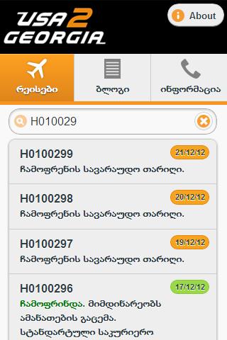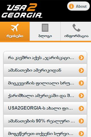 USA2Georgia-ს არაოფიციალური აპლიკაცია. ადევნეთ თვალი რეისების განრიგს, ჩამოსვლის თარიღებს და სტატუსებს. იხილეთ ბლოგ-პოსტები და სხვა ინფორმაცია.
