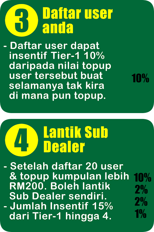 1. INCOME PASIF : INSENTIF 10-15% daripada topup semua pelanggan yang anda daftar SETIAP BULAN.