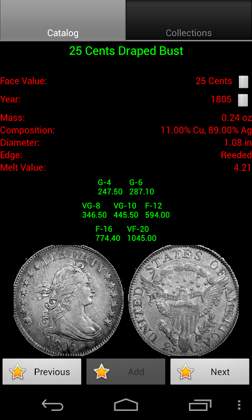 3. Each coin in the catalog includes value per grade, melt value, composition, diameter, edge type and mass.