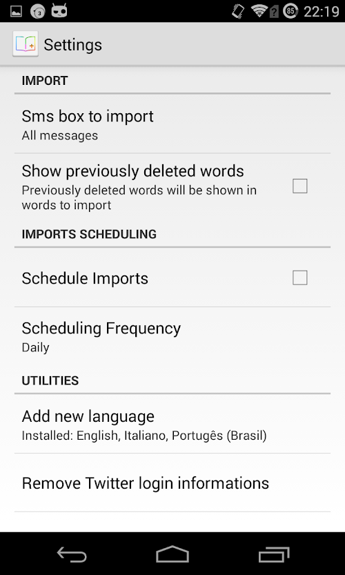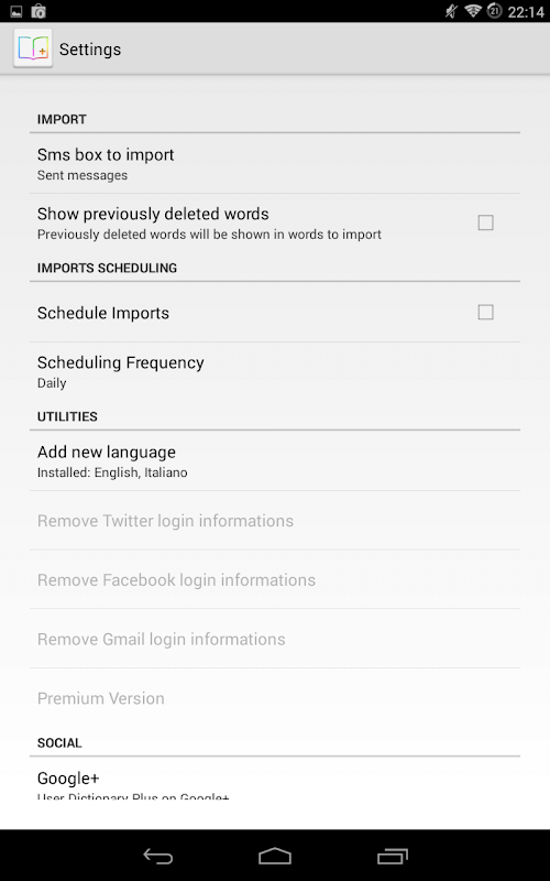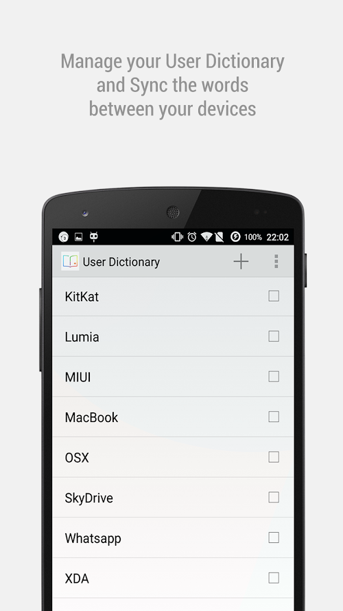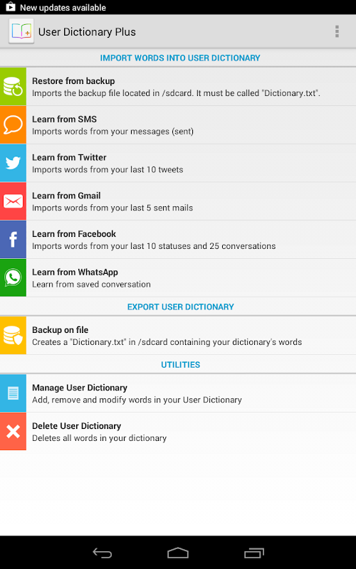 User Dictionary Plus will personalize your device with words you use most from Messaging apps, Social networks, SMS and emails.