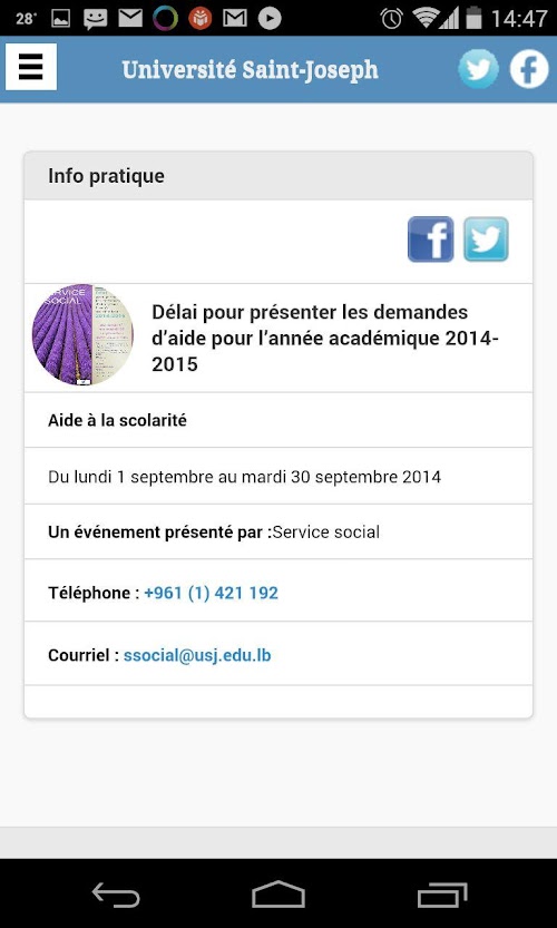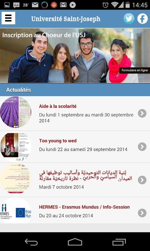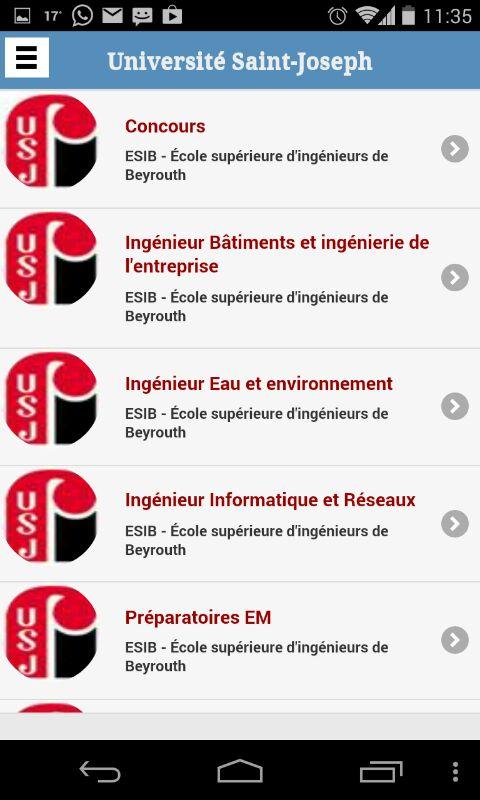 The Université Saint-Joseph de Beyrouth (USJ) mobile application allows you to receive notifications, to discover the University’s academic and administrative institutions, to learn about its academic programs, to know all about the latest news and activities and much more.