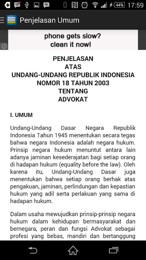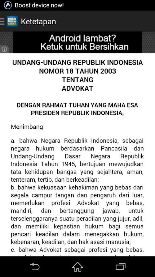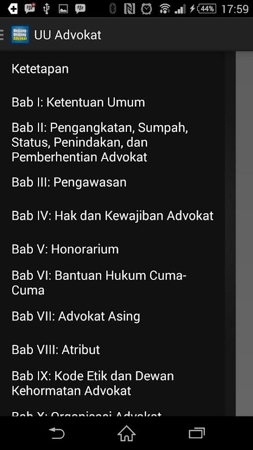 "UU Advokat" adalah aplikasi yang memuat mengenai kitab undang-undang Republik Indonesia no. 18 tahun 2003 mengenai profesi advokat, lengkap beserta pasal dan penjelasannya."Advocate Law" is an application that contains the book of the law of the Republic of Indonesia no. 18 of 2003 regarding the profession of advocate, complete with chapters and explanation.