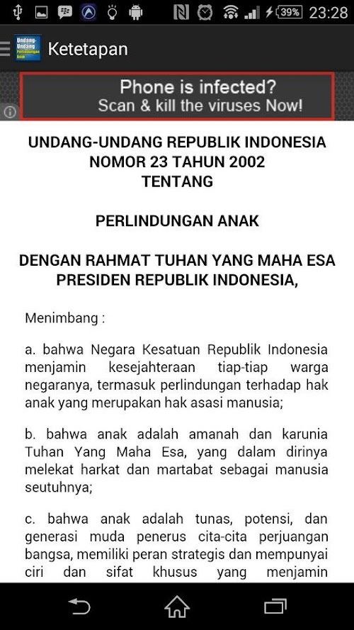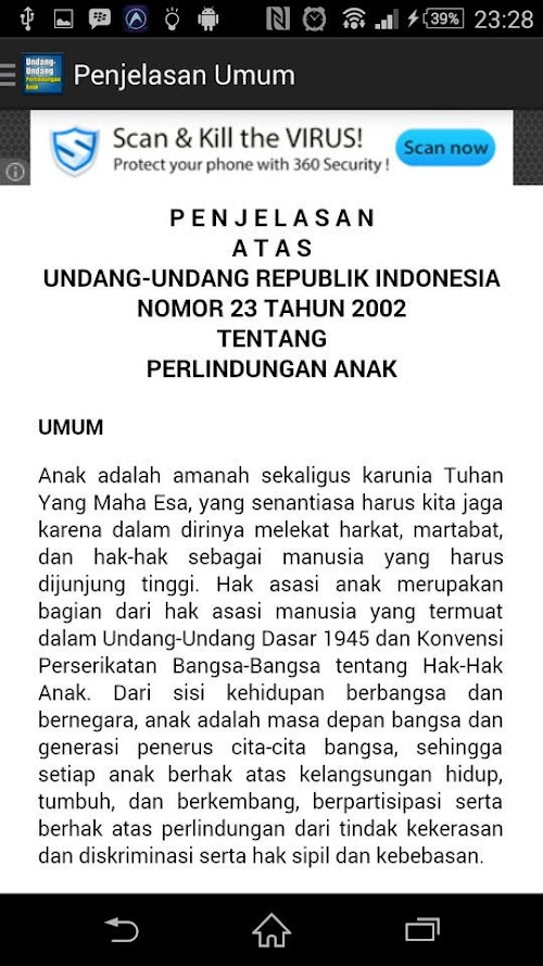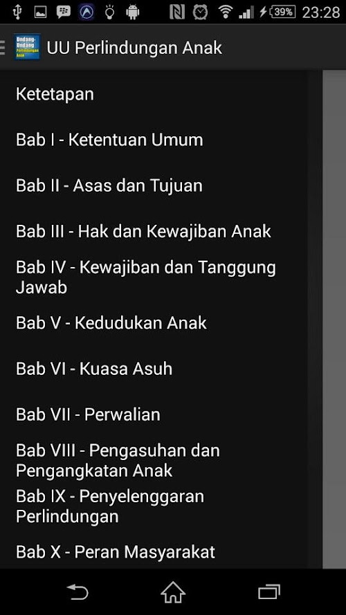 "UU Perlindungan Anak" adalah aplikasi ringan yang memuat lengkap kitab undang-undang republik Indonesia No. 23 tahun 2002 mengenai perlindungan hak anak sebagai bagian dari hak asasi manusia. Dalam UU ini, tercantum lengkap segala tata cara, aturan, kewajiban, hak, dan segala sesuatu yang berhubungan dengan perwujudan perlindungan dan kesejahteraan anak Indonesia, terutama melalui pemberian jaminan terhadap pemenuhan hak-hak mereka serta adanya perlakuan tanpa diskriminasi. Dengan sistem navigasi yang mudah dan isi yang komplit (termasuk juga penjelasan pasal), maka aplikasi UU Perlindungan Anak ini cocok untuk menjadi pegangan bagi siapa saja yang membutuhkan referensi praktis mengenai hukum perlindungan anak dan segala aspeknya."Child Protection Act" is a lightweight application that contains the complete book of the law of the republic of Indonesia No. 23 of 2002 concerning the protection of children's rights as part of human rights. In this Act, a complete set of all ordinances, rules, obligations, rights, and everything related to the embodiment of the protection and welfare of children in Indonesia, particularly through the provision of guarantees for the fulfillment of their rights and their treatment without discrimination. With easy navigation system and the contents are complete (including the explanation of article), then the application of the Child Protection Act is fit to be a guide for anyone who needs a handy reference regarding child protection laws and all its aspects.