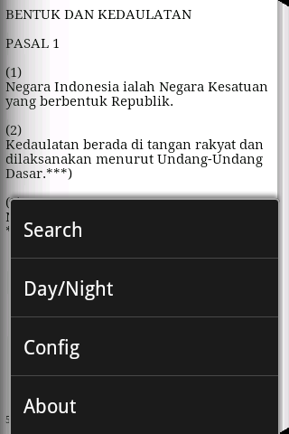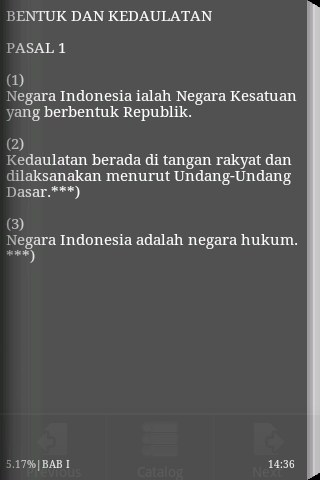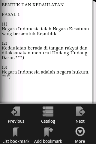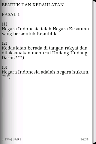 Pengaturan spasi tulisanThis book contains the application of the Republic of Indonesia 1945 complete with opening and changes in the articles adapted to the latest amendments to the law. Allows you to increase the national awareness without the need to bother opening the book or download from the internet 1945. With this application you can study the 1945 Constitution without the hassle of carrying books everywhere because this application on your smartphone. Hopefully with this application can help you learn the 1945 Constitution and make you more loving homeland Indonesia. Amien