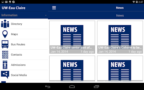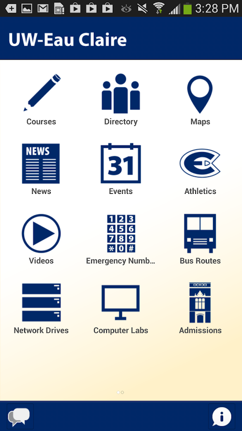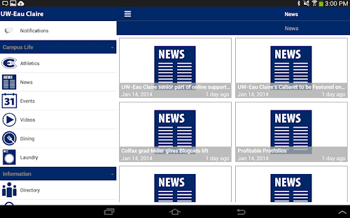 Go Blugolds! UW-Eau Claire Mobile is your guide to life on and around campus. Access your D2L to view courses, grades, assignments and class rosters, and even add your exam schedule directly to your personal calendar – you don't want to miss those! Are you a new Blugold? Locate your classes and get directions via Maps, and check out the bus routes and schedules. Stay connected with news and videos whether you are in your room or studying abroad. UW-Eau Claire Mobile puts helpful info in your hand. Just download and go!