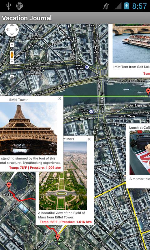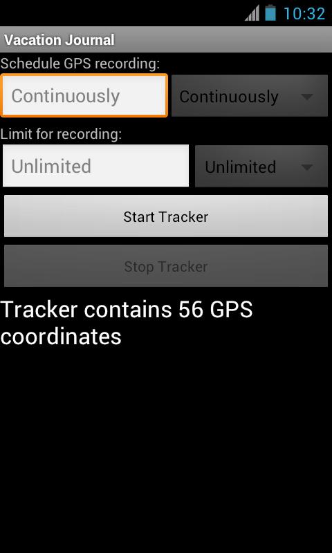 Track your trip via constant GPS readings. Track unlimited paths within each vacation (for example, your vacation broken down into tracks for each day) and have each track/path displayed on a map in different colors.